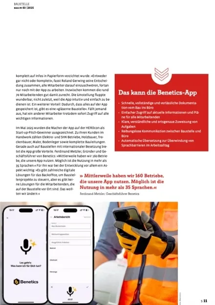 Im Mai 2025 wurden die Macher der App auf der HEROcon als Start-up-Pitch-Gewinner ausgezeichnet. Zu ihren Kunden im Handwerk zählen Elektro- und SHK-Betriebe, Holzbauer, Trockenbauer, Maler, Bodenleger sowie komplette Bauleitungen. Gerade auch auf Baustellen mit internationaler Besetzung bietet die App große Vorteile. Ferdinand Metzler, Gründer und Geschäftsführer von Benetics: »Mittlerweile haben wir 160 Betriebe, die unsere App nutzen. Möglich ist die Nutzung in mehr als 35 Sprachen.« Für ihn war bei der Entwicklung vor allem ein Aspekt wichtig: »Es gibt zahlreiche digitale Lösungen für das Backoffice, um Baustellenprojekte zu steuern, aber es gibt keine Lösungen für die Mitarbeitenden, die auf der Baustelle vor Ort sind. Das wollten wir ändern.«