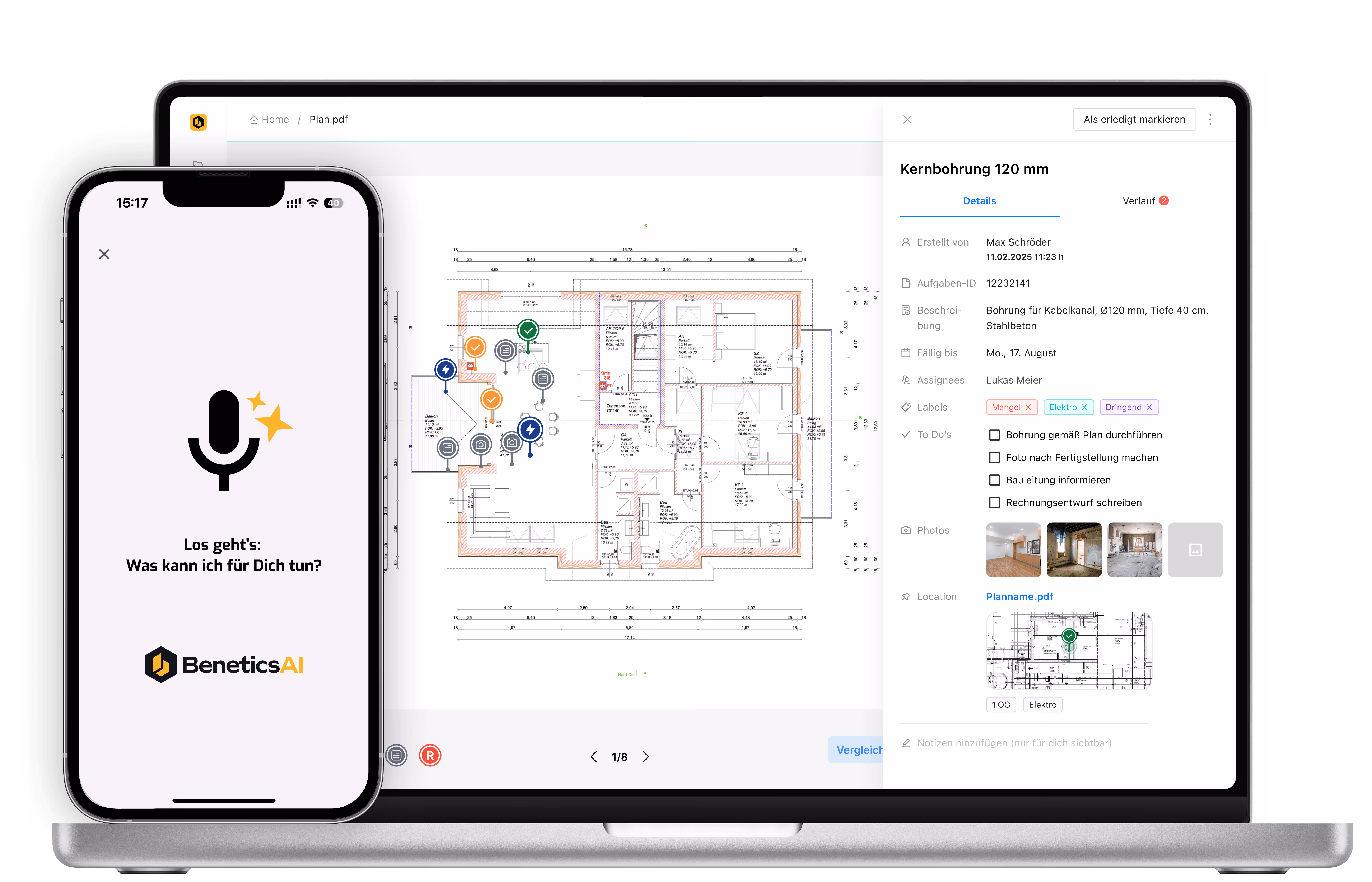 Benetics AI hebt die aufgabenbasierte Kommunikation im Bau auf ein neues Level. Aufgaben zuweisen und verfolgen wird durch das Baukommunikation-Tool schnell und einfach erledigt. Aufgaben werden direkt auf dem Plan verortet und auf Wunsch zugewiesen - inklusive Checklisten, Fotos und Fälligkeit.